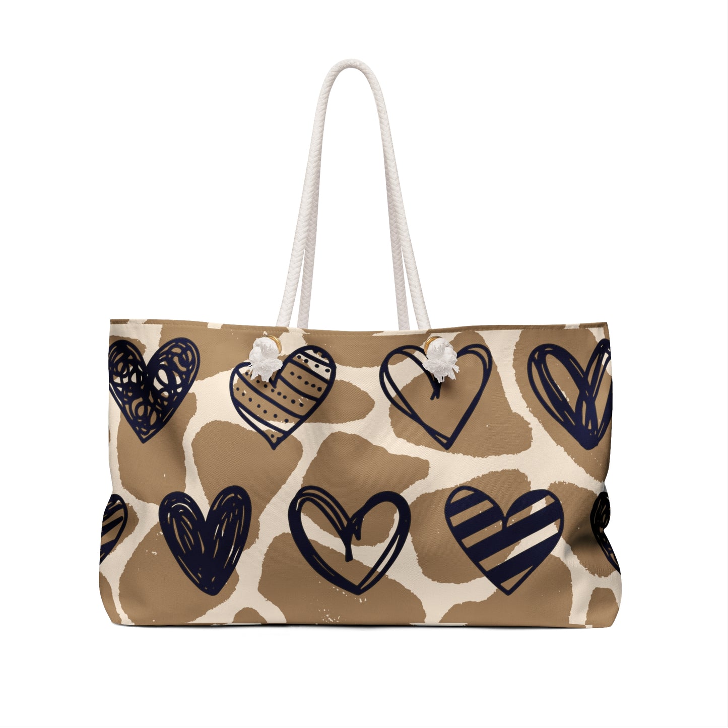 Hey Family! Check out our elegant Full of Hearts weekender bag that shows love and style! Grab yours today! Our oversized Weekender Tote is perfect for your weekend at the beach or in town. The wide-mouthed, durable bag holds a generous amount of personal items and is easily held by its thick rope handles.