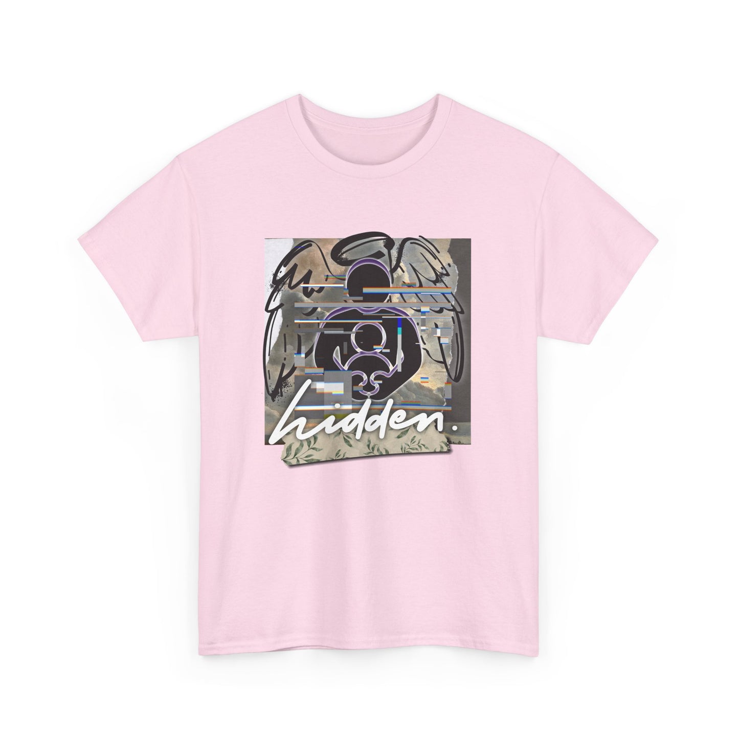 The shirt features an iconic design of a stick figure holding a child’s hand, symbolizing the strength and protection found in Christ. With wings emerging from behind them, it symbolizes spiritual elevation and divine guidance. The glitch effect over the design adds a modern, creative touch, while the word “Hidden” beneath the figures serves as a reminder of our identity in Christ.