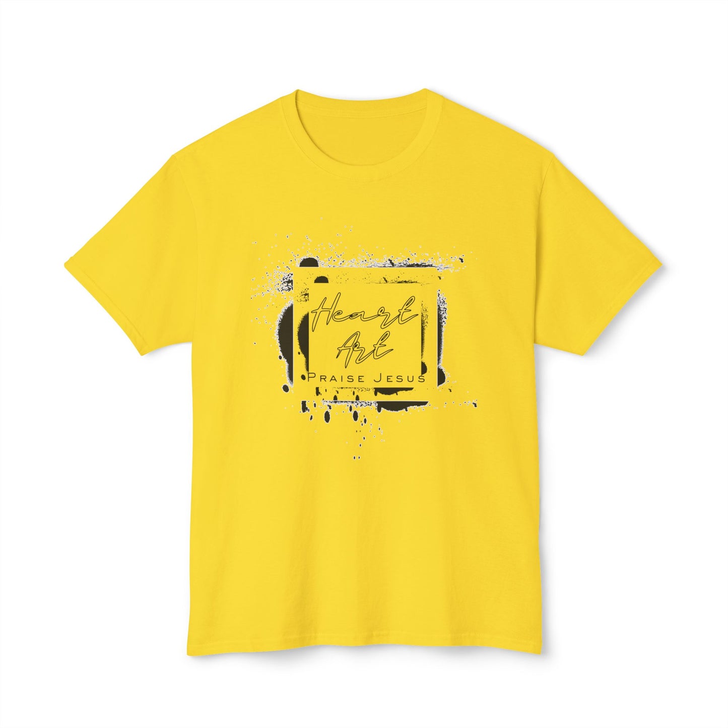 A trendy and stylish T-shirt with 3 abstract squares stacked on top of each other, adorned with paint splats. The design features the phrase 'Heart Art Praise Jesus' below the squares. Perfect for those looking to make a bold statement with their clothing, and ideal for spiritual individuals looking to express their faith. Great for casual wear or as a conversation starter during religious holidays and gatherings.